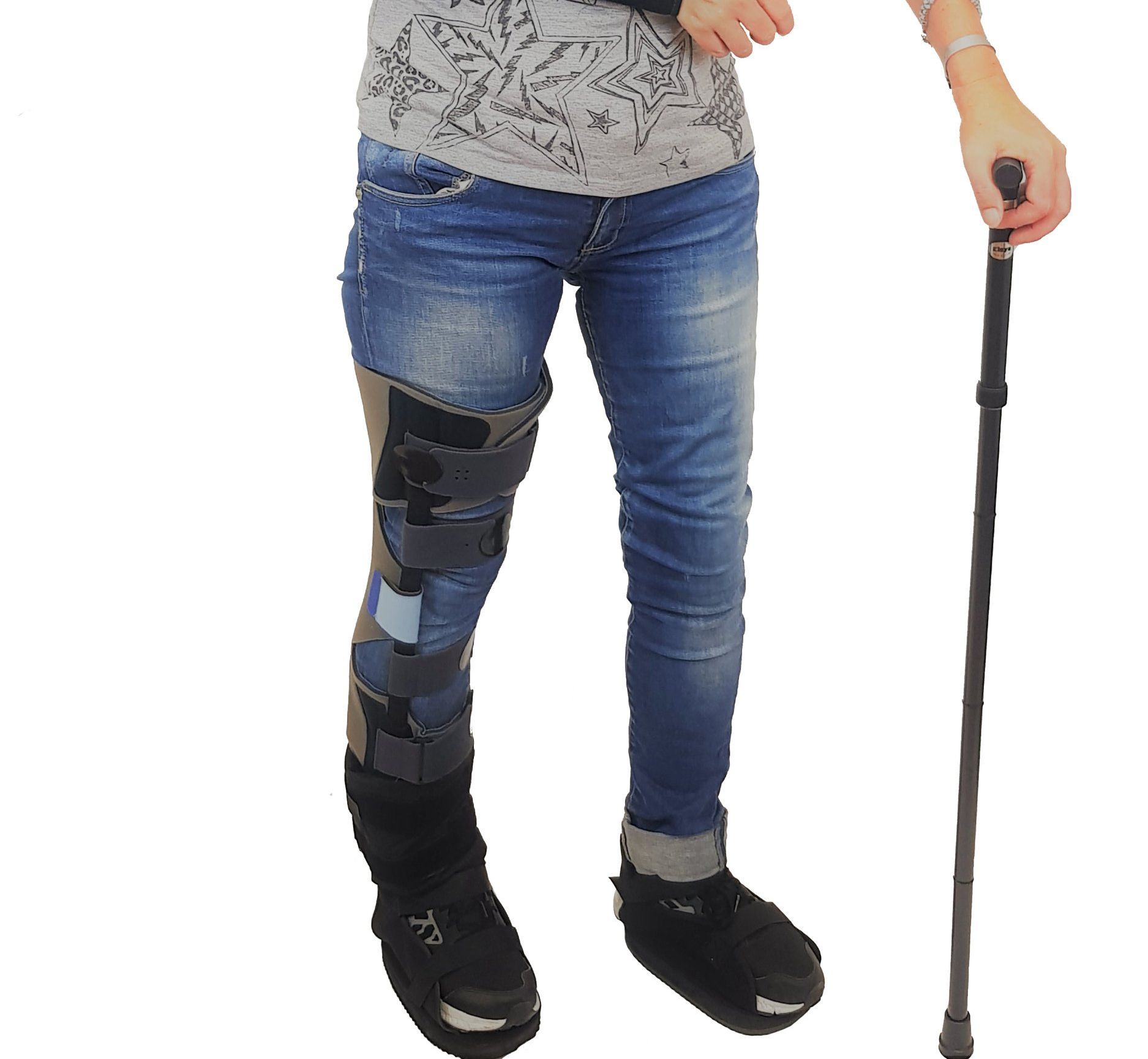 Die Beinschiene simuliert die Spastik und Steifheit des Beines und den typischen im Halbkreis nach vorne geführtem Gang.