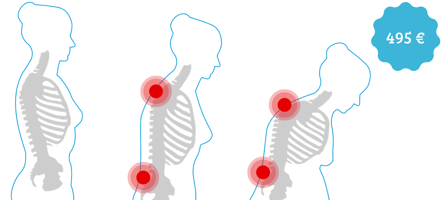 Unser Dispositiv simuliert die Bewegungseinschränkung aufgrund der durch Rückenschmerzen verursachten Rückensteifheit. Rückenschmerzen führen unweigerlich zu einer schlechten Körperhaltung, Einschränkungen bei allen Bewegungen und damit einem täglichen Handicap.